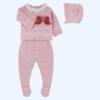 סט תינוקות מהודר בגוון ורוד פסטלי רך, הכולל חולצה סרוגה עם דוגמת תחרה עדינה ופפיון קטיפה יוקרתי במרכז שמעניק נגיעה קלאסית מלאת שיק. הצווארון הלבן המעוטר מוסיף אלגנטיות רכה, והכובע התואם משלים את המראה בחן עדין ומלכותי. המכנס התואם עם רגליות סרוגות מבטיח נוחות מושלמת לצד מראה מתוק שאין לעמוד בפניו.