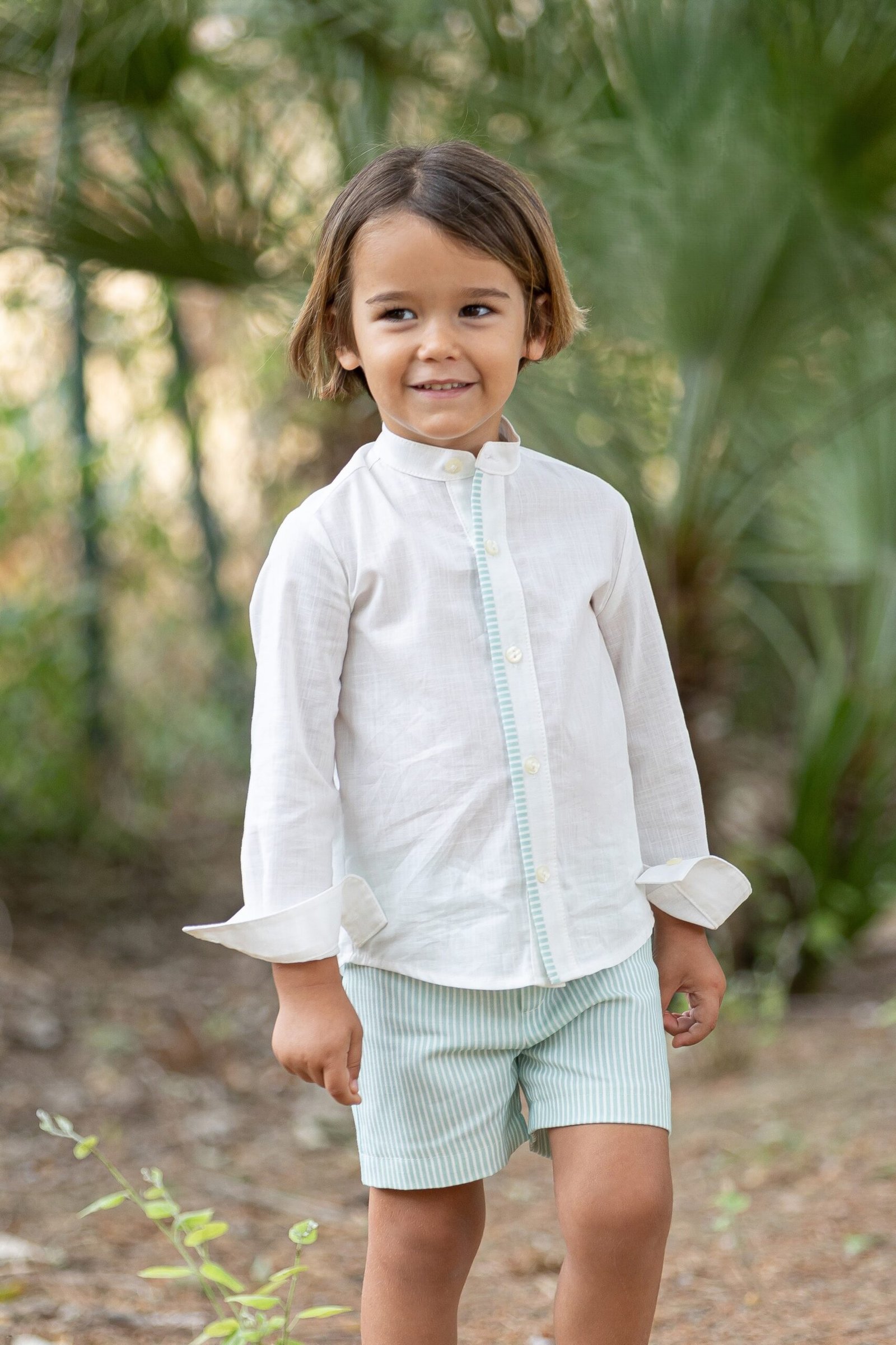 חולצה לבנה קלאסית עם צווארון עומד וכפתורים מעוצבים, בשילוב מכנסיים קצרים מפוספסים בגוון תכלת עדין.