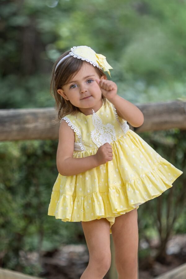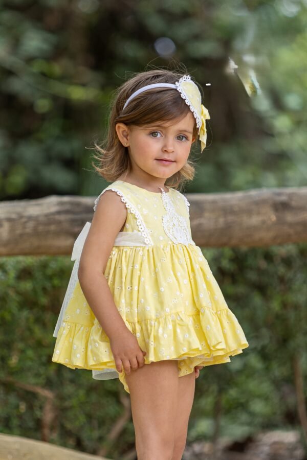 שמלה קלילה בגוון צהוב שמשי עם רקמת פרחים עדינה ותוספות תחרה לבנה בחזה ובכתפיות.