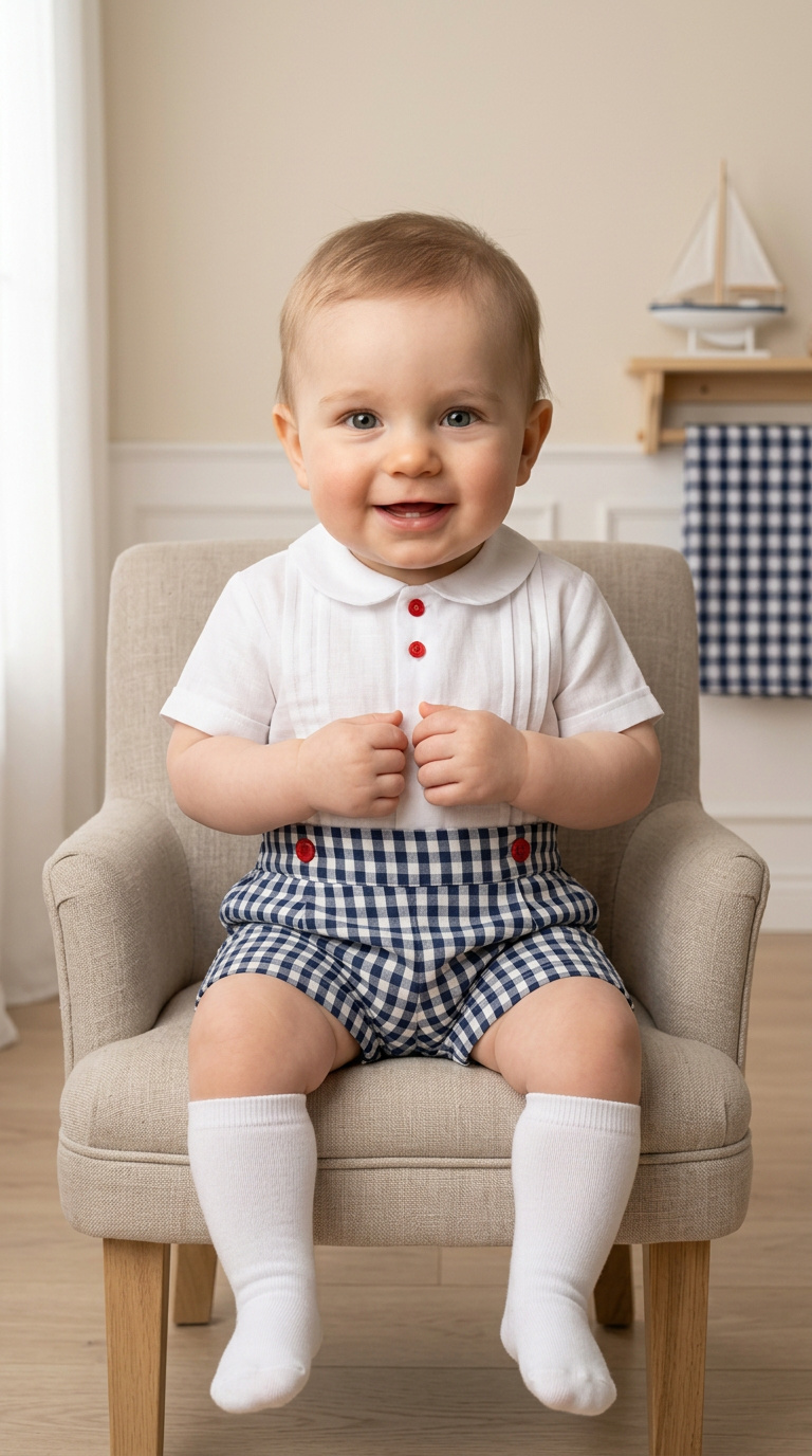 סט מקסים לבנים המשלב חולצה לבנה נקייה עם מכנסיים קצרים משובצים בגוון כחול עמוק, ליצירת מראה על-זמני ומלא סטייל. החולצה עם צווארון עגול וכפתורים אדומים קטנים מוסיפה טאץ’ שובב ועדין, בעוד המכנסיים בגזרת מותן גבוהה מעניקים לוק מוקפד וקלאסי.