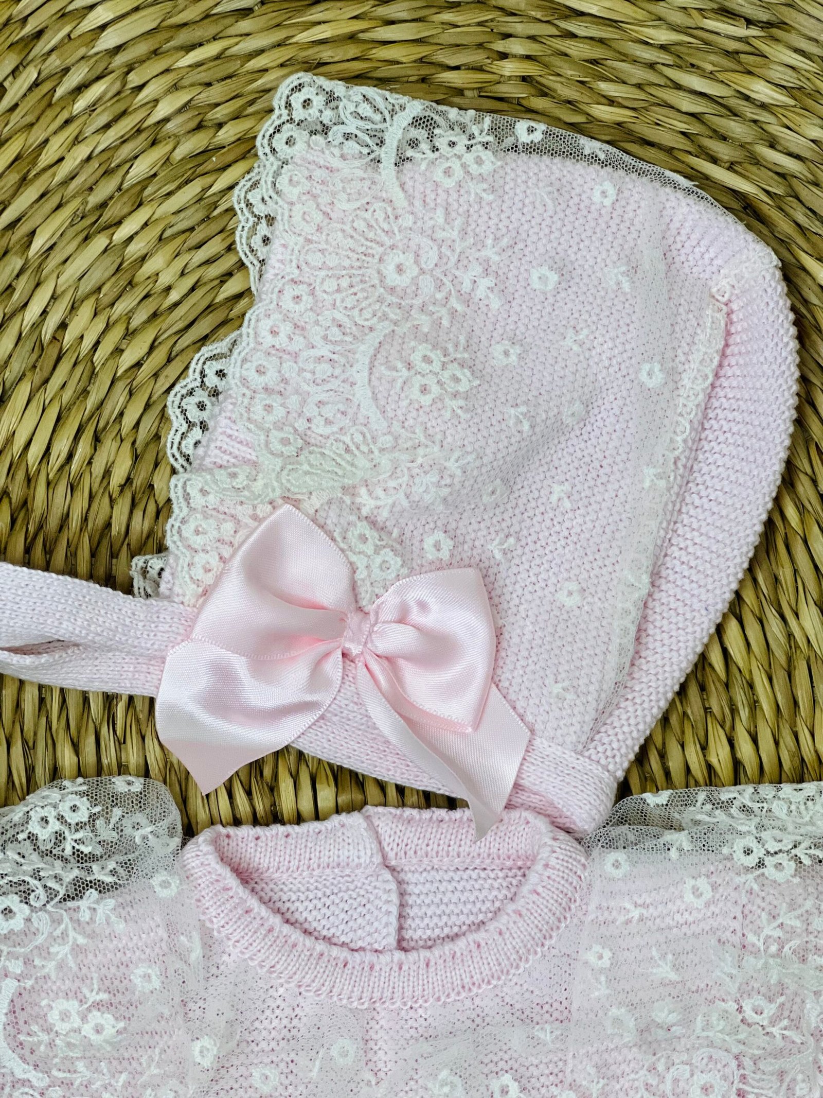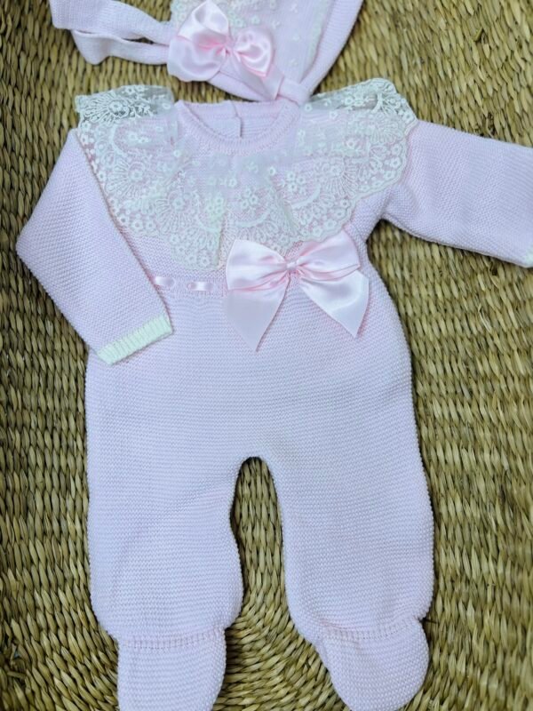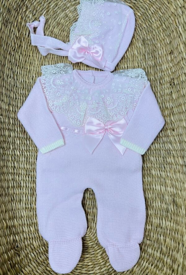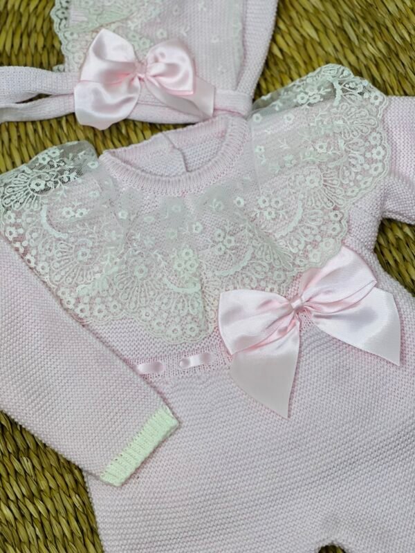 אוברול סרוג בגוון ורוד פסטלי רך, בשילוב תחרת פרחים לבנה עשירה היוצרת מראה עדין ומלכותי. פפיון סאטן ורוד במרכז מוסיף טאץ' אלגנטי, והכובע התואם משלים את הסט במראה קלאסי ומלא חן.