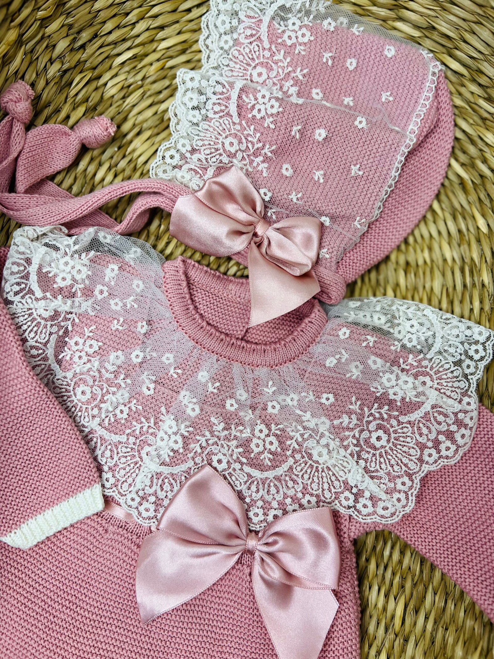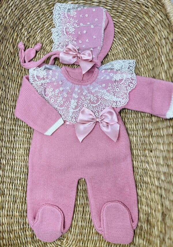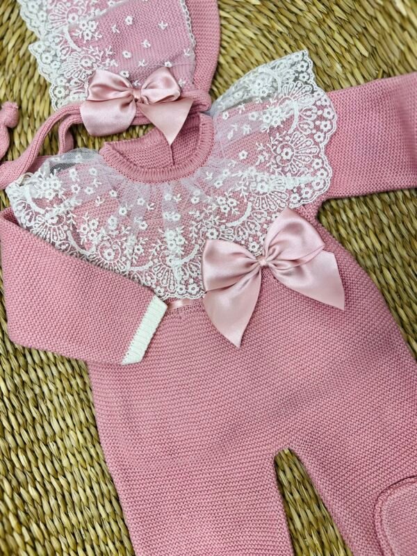 אוברול סרוג בגוון ורוד רך עם עיטורי תחרה לבנה עשירה, המעטרת את הצווארון והחזה למראה מלכותי מלא אלגנטיות. פפיוני סאטן ורודים עדינים מקשטים את החזית ואת הכובע התואם, ומשלימים את העיצוב הקלאסי בסגנון ספרדי ייחודי.