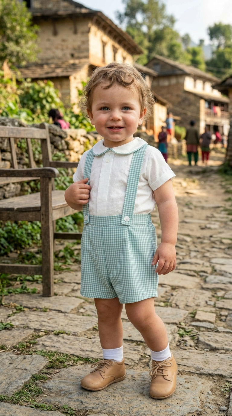 לוק מתוק ועל-זמני המשלב חולצה לבנה רכה עם צווארון עדין יחד עם מכנסיים קצרים משובצים בגוון ירוק פסטלי ושלייקס תואמים. העיצוב יוצר מראה מוקפד, טבעי ומלא קסם – כאילו יצא מתוך סיפור ילדים.